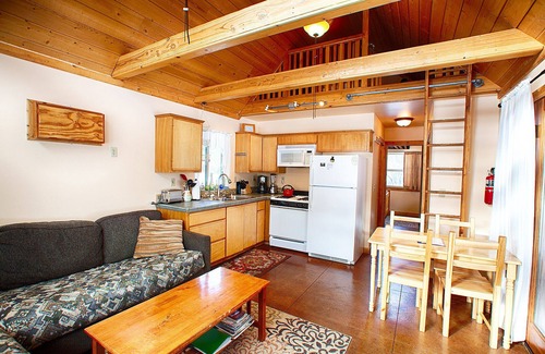 The cabin has a full bath, full kitchen, and reading loft. Each cabin also has its own patio with a high quality Weber gas barbecue