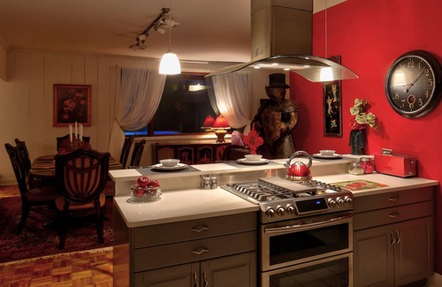Walking inside, you’ll be delighted to find a gourmet kitchen with new stainless-steel appliances including a 5 burner gas range with double convection oven at the bar-height island. The open concept great room boasts a wood burning fireplace, built-in reading nook and dining. In the summer, you have a breathtaking view of the pool throughout. Be sure to greet the knight in shining armor and his Viking princess! There are 3 enticing bedrooms. The King bedroom suite includes a large screen Roku TV, walk-thru closet plus a spa-like bath featuring a double walk-in shower, jetted tub and dual vanities with built-in make-up table. The huge Queen bedroom has a game table, tons of closet space & a Roku TV. The third Family Fun Bunk bedroom has a double bed + bunk beds with "paper" lantern string lights and Roku TV. Can you read the word painted by local traveling graffiti artist Ramon Trevino beside the double bed? The second bath includes a library, pool lockers, double vanity and access to the utility room with a new washer and dryer. Central air conditioning and high ceilings add to an already amazing home. By the way, each bedroom has an alarm clock with cell phone chargers – just bring the cords that fit your phones. And did you notice that all of our TVs are Roku which offer many streaming options? We also provide Disney+ and Prime movies for even more entertainment!